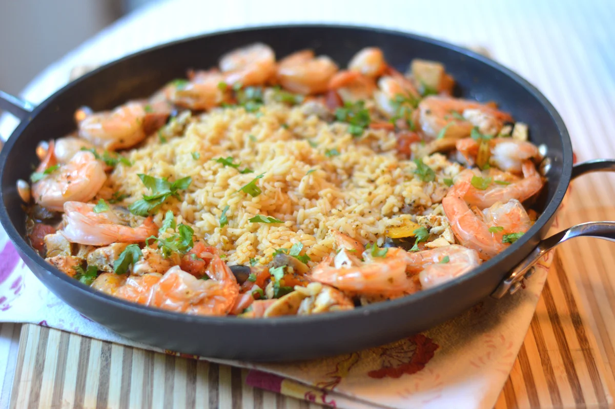 2. Add garlic to pan and saute 1 minute on low heat. Add olives, mushrooms, chicken, ham and lemon juice, stir well to combine. Sprinkle with thyme, oregano, salt and pepper. Pour wine into skillet and stir. Place shrimp in pan around edge. Make a hollow in the center of pan and pour rice into it.